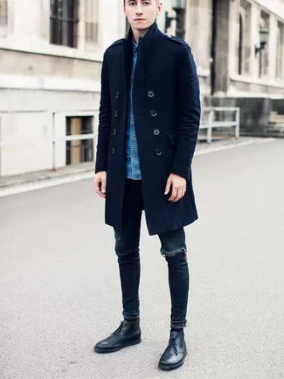 - Ngoài ra nếu bạn muốn theo phong cách cổ điển pha chút vintage. Hãy cổ điển và giản dị hãy kết hợp nó theo chuyên gia thời trang nam trong chiếc áo khoác màu camel và quần jean xanh. Cùng với bốt da nâu như là chất keo kết dính bộ trang phục này lại với nhau. Tạo nên phong cách đơn giản, cổ điển và trông thật nhẹ nhàng cho quý ông. Hãy thêm vào tủ đồ mình những đôi giày boot tạo dấu ấn cho phong cách của bạn. Hay một số quần áo để tăng thêm tính thời trang cho những bộ trang phục mà bạn có thể kết hợp với nhau.