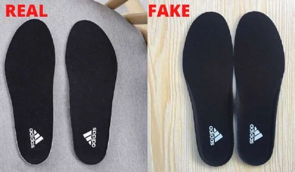 Ví dụ dưới đây là cách phân biệt giày Real và giày Fake đơn giản của Adidas bằng phần lót giày. Đối với giày Real dòng chữ Adidas được in trên 2 miếng lót giày sẽ quay vào nhau chứ không nằm trên một hướng như giày Fake.