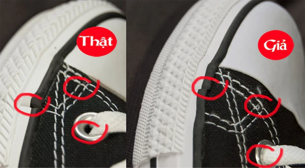 Phần gót của một đôi giày chính hãng sẽ được cắt tỉ mỉ và chính xác để đảm bảo độ chắc chắn và thoải mái cho người mang. Ngược lại với giày nhái, đế giày có đường cắt xô lệch và không thằng hàng.