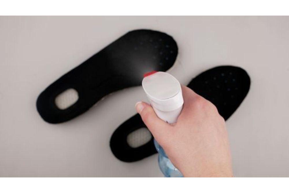Bước 2: Xịt hỗn hợp cồn vào đế lót giày.